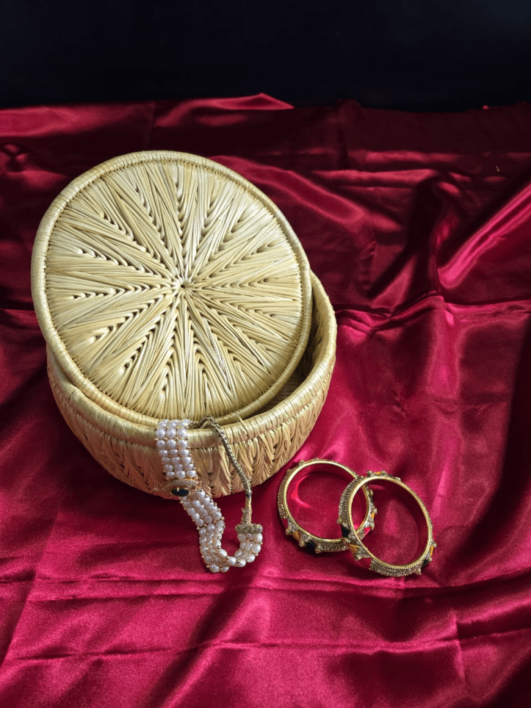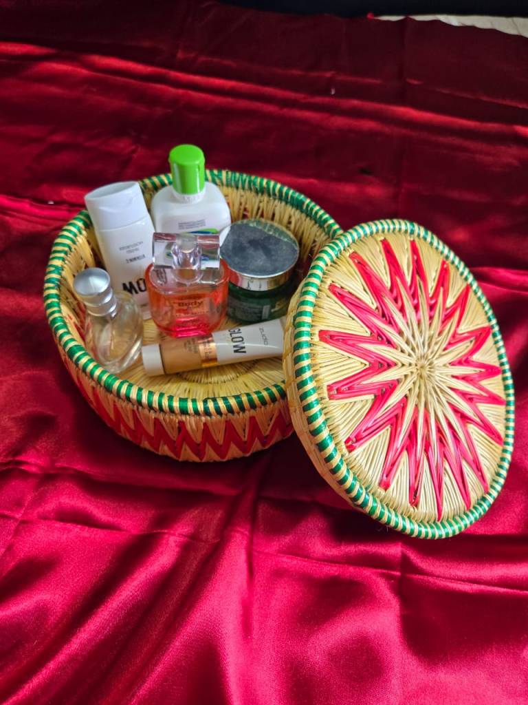 Decorative round box ideal for gifting or storage.